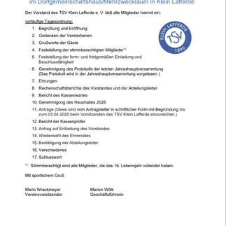 13.03.2026: Einladung zur Jahreshauptversammlungvor 2 Stunden1 Min. LesezeitDer TSV Klein Lafferde lädt zur Jahreshauptversammlung am 17.04.2026 um 17 Uhr im Dorfgemeinschaftsraum in Klein Lafferde ein.